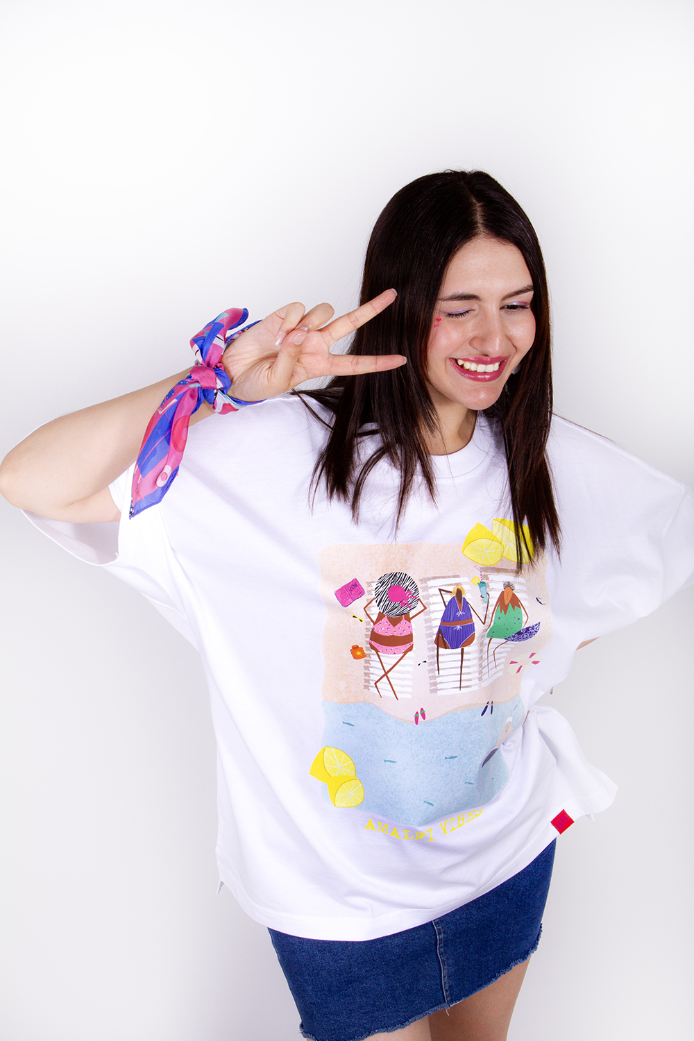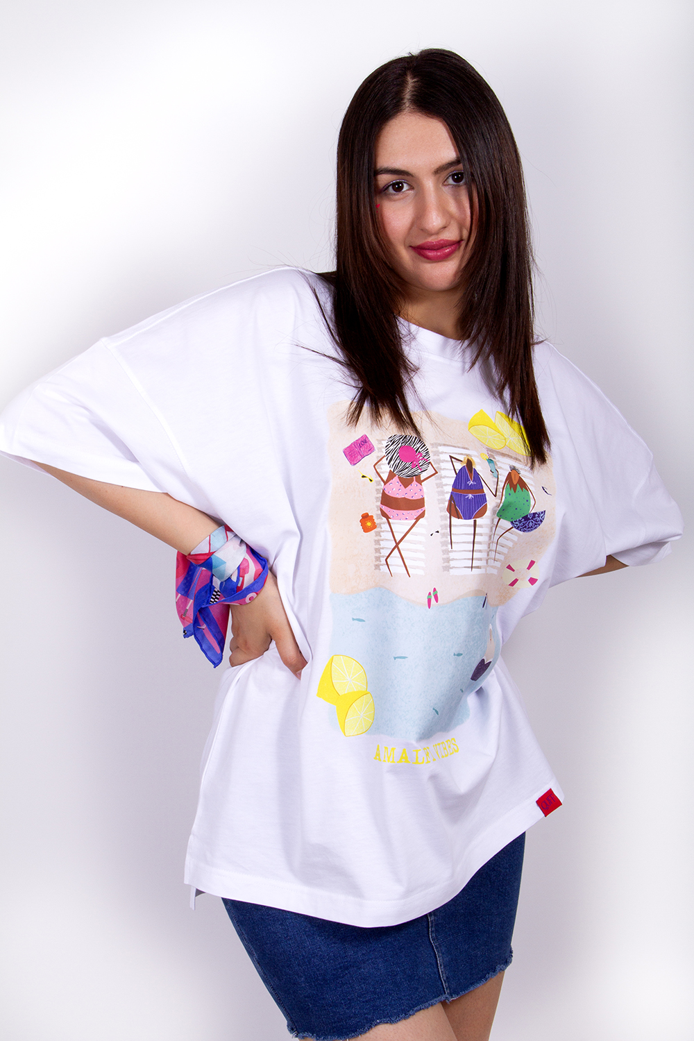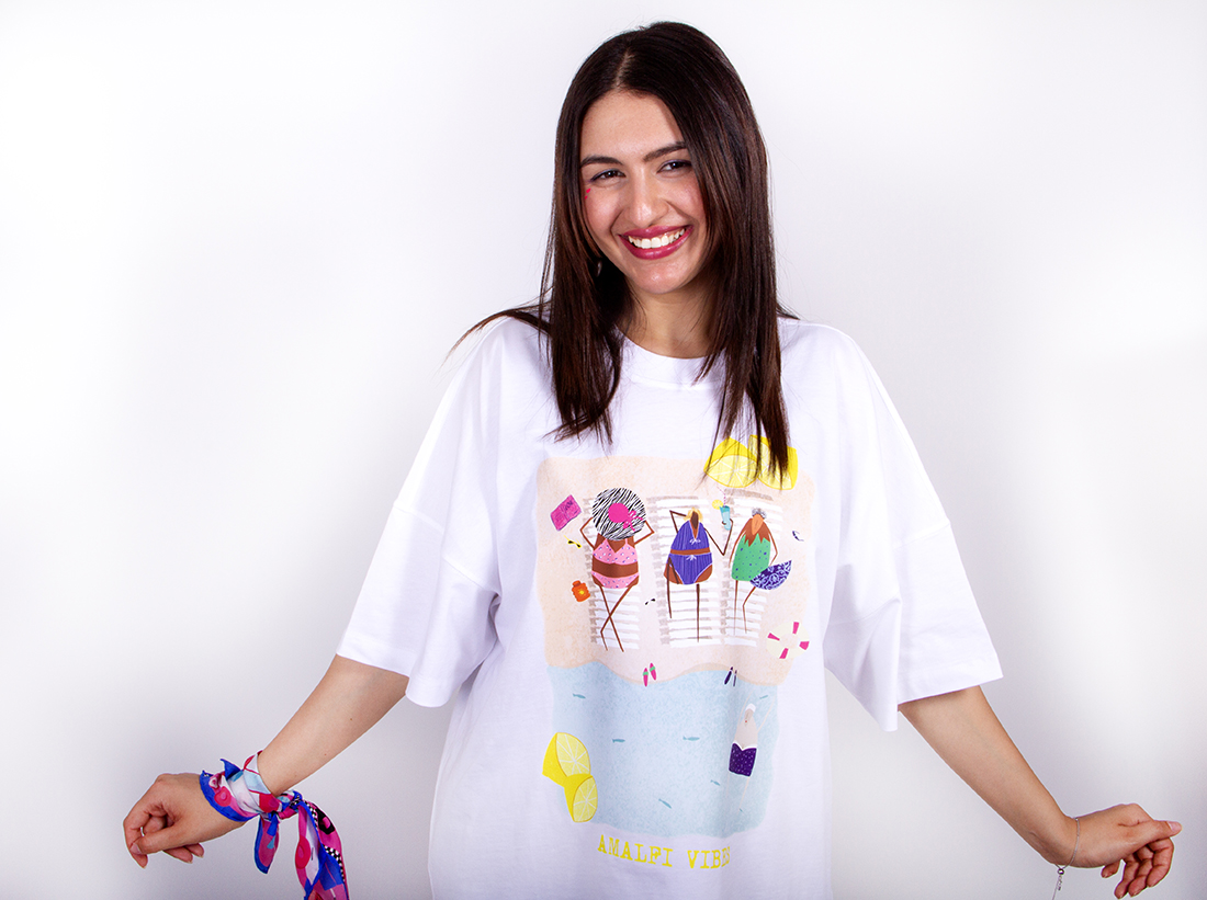 Amalfi Beach Tasarımlı %100 pamuk t-shirt. El çizimi tasarım ve kaliteli baskı ile öne çıkan Quff’un benzersiz koleksiyonu.