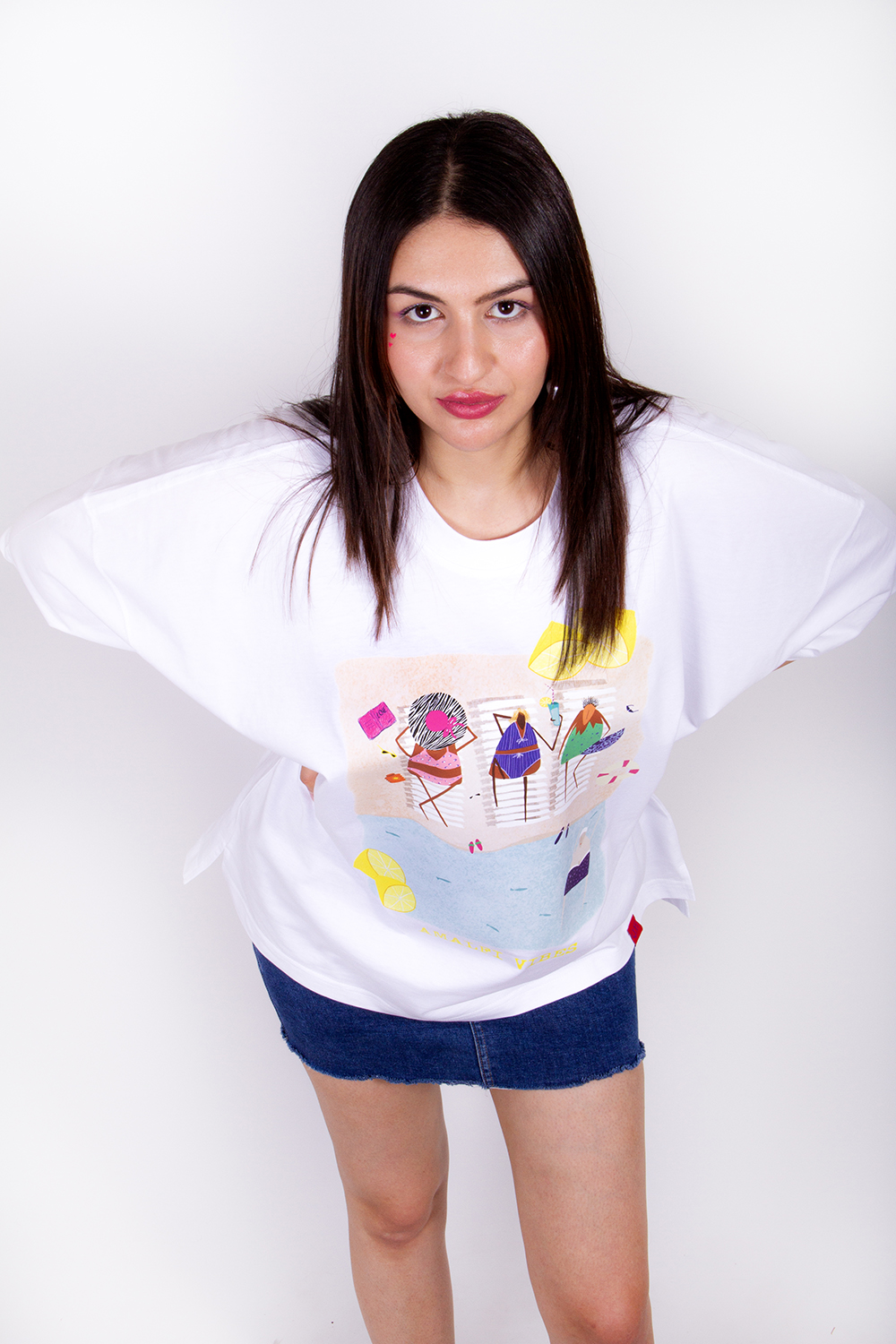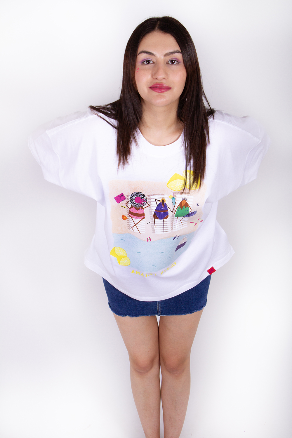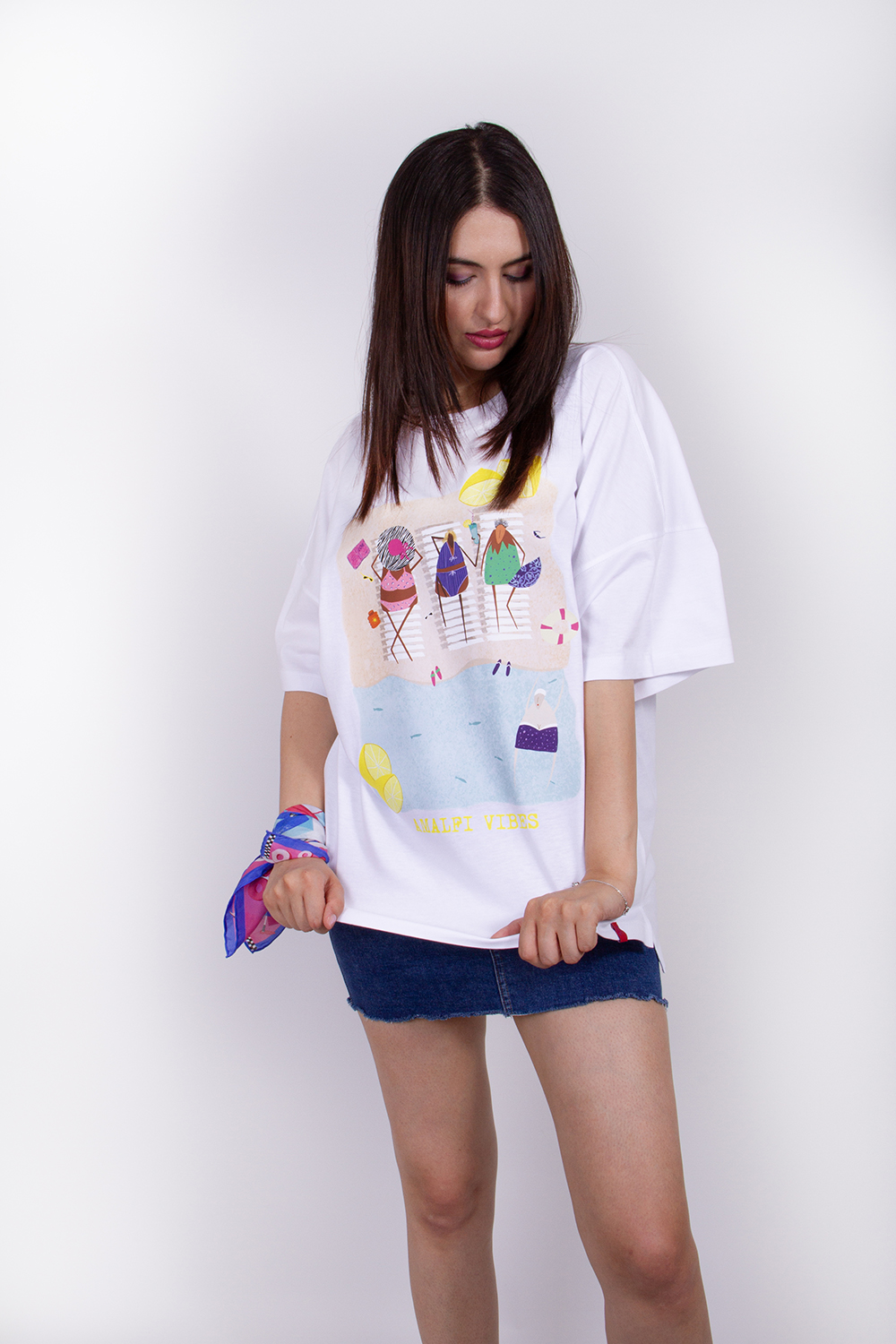 Amalfi Beach Tasarımlı %100 pamuk t-shirt. El çizimi tasarım ve kaliteli baskı ile öne çıkan Quff’un benzersiz koleksiyonu.