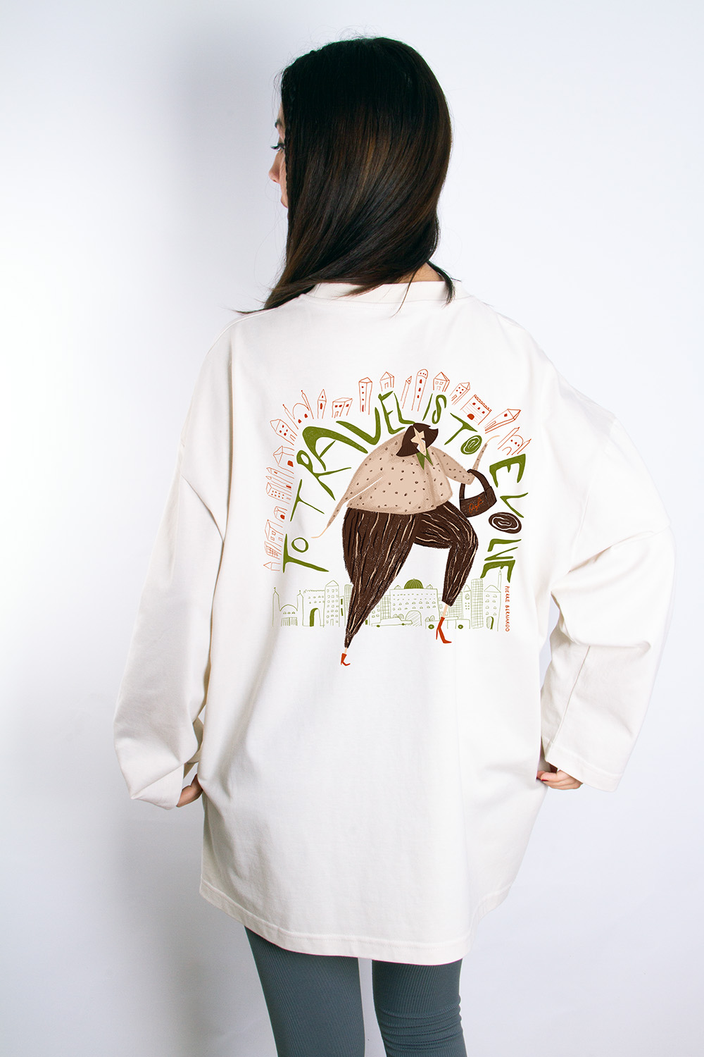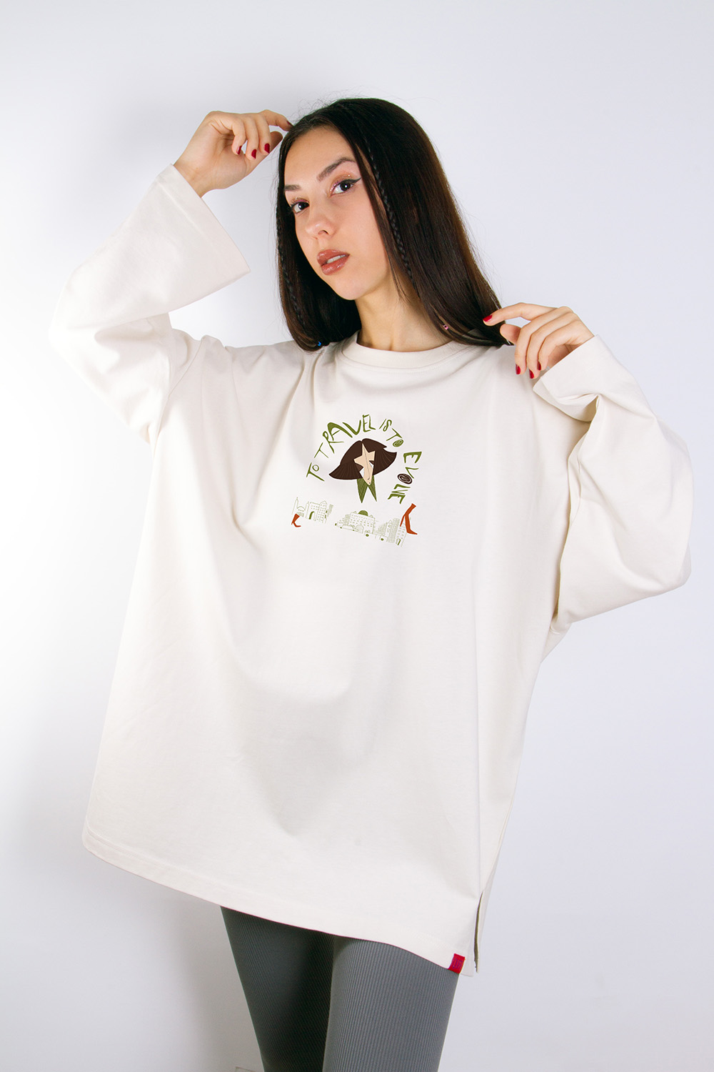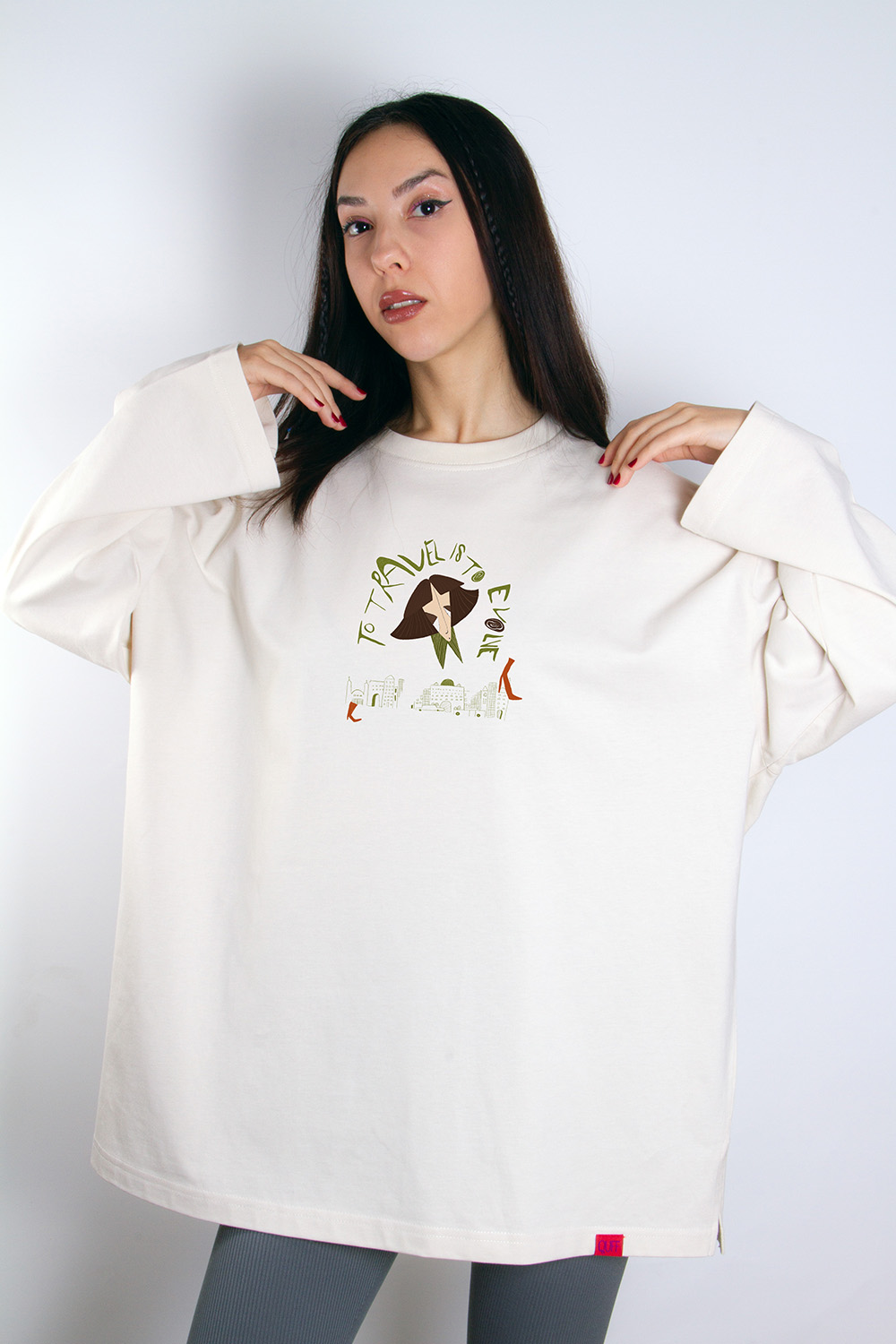 Standart Beden – Taş Rengi – %100 Cotton – Travel Tasarımlı Uzun Kollu Sweatshirt.